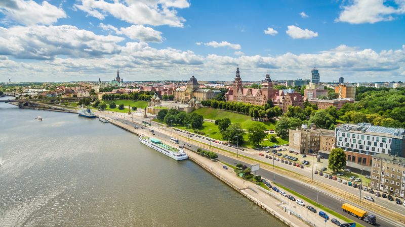 Szczecin se trouve au cœur d’une zone portuaire, dans une lagune au nord de la Pologne, près de la frontière avec l’Allemagne. Ville verte entourée de forêts, la ville possède de nombreux monuments et édifices remarquables, comme l’imposant château ducal, situé dans la vieille ville, ou encore Waly Chrobrego, magnifique promenade en front de mer offrant un point de vue imprenable sur la rivière Oder et le port de Szczecin. A la nuit tombée, les fontaines de la promenade s’illuminent et créent une ambiance féérique.