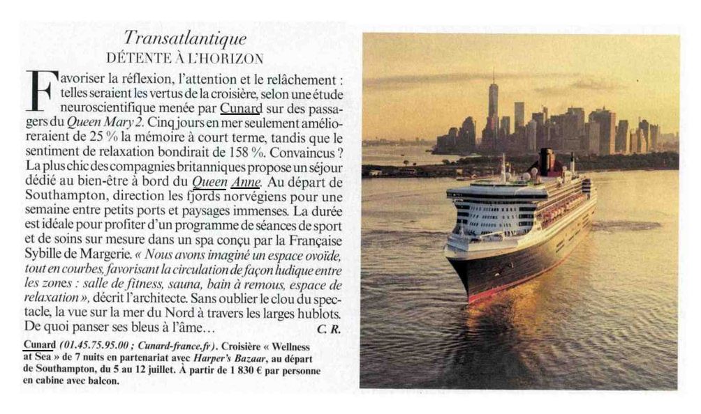 Le magazine mensuel Pleine Vie a eu le plaisir d'effectuer une traversée transatlantique entre Le Havre et New York à bord de Queen Mary 2, navire emblématique et unique paquebot à traverser régulièrement l’Atlantique. A bord, les passagers peuvent revivre la splendeur des croisières d’autrefois dans une ambiance irrésistiblement élégante et luxueuse. Il incarne les fastes d’une époque où l’on prenait le temps de vivre. La magie opère toujours et met le temps entre parenthèses pendant une semaine de voyage entre l’Europe et les Etats-Unis. Ce voyage est raconté sur un article de 4 magnifiques pages relatant l'ambiance à bord. Les prochains départs de France sont prévus le 1er mai 2026 du Havre et le 9 juin 2026 de Cherbourg.