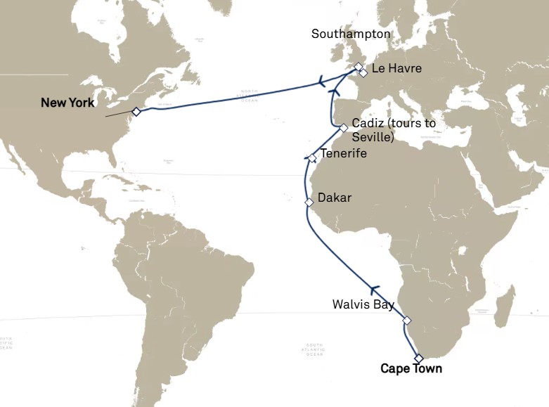 Le transport aérien est compris pour les traversées transatlantiques avec assistance francophone du 1er mai 2026 (M609C), 8 et 9 juin 2026 (M611D). Non applicables aux autres traversées transatlantiques.
