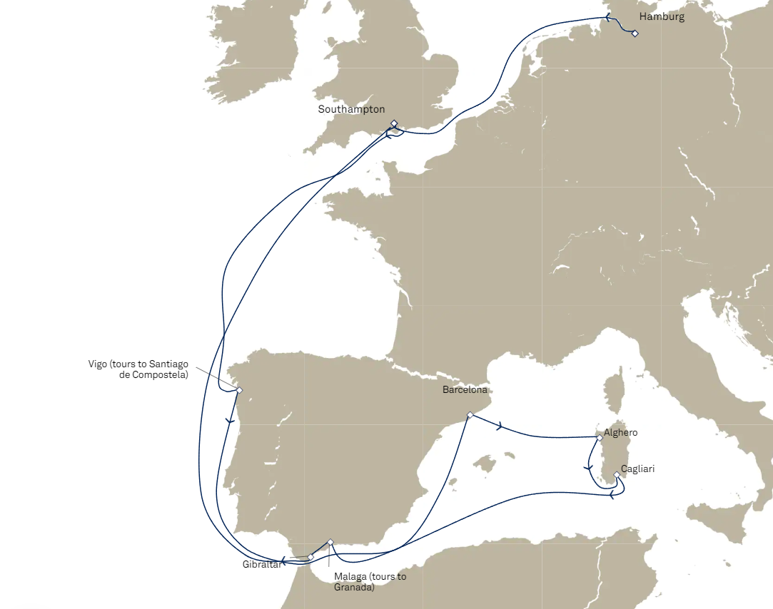 - Les excursions facultatives disponibles à Cherbourg (pour les passagers ayant embarqués au Havre le 8 juin) et à Southampton