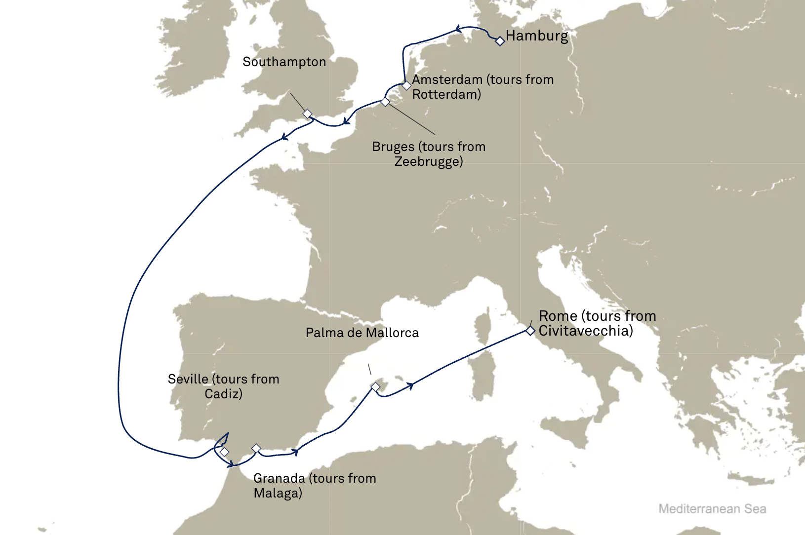 - Les excursions facultatives disponibles à Cherbourg (pour les passagers ayant embarqués au Havre le 8 juin) et à Southampton