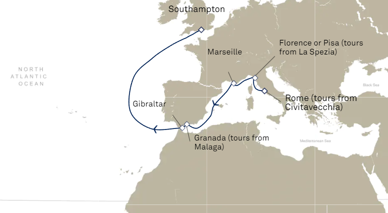 - Les excursions facultatives disponibles à Cherbourg (pour les passagers ayant embarqués au Havre le 8 juin) et à Southampton