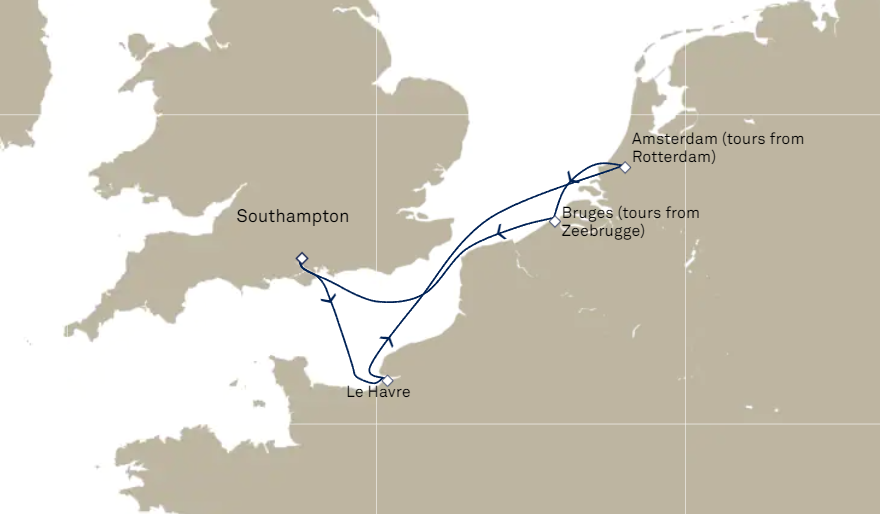 -          Les excursions facultatives disponibles à Cherbourg (pour les passagers ayant embarqués au Havre le 8 juin) et à Southampton