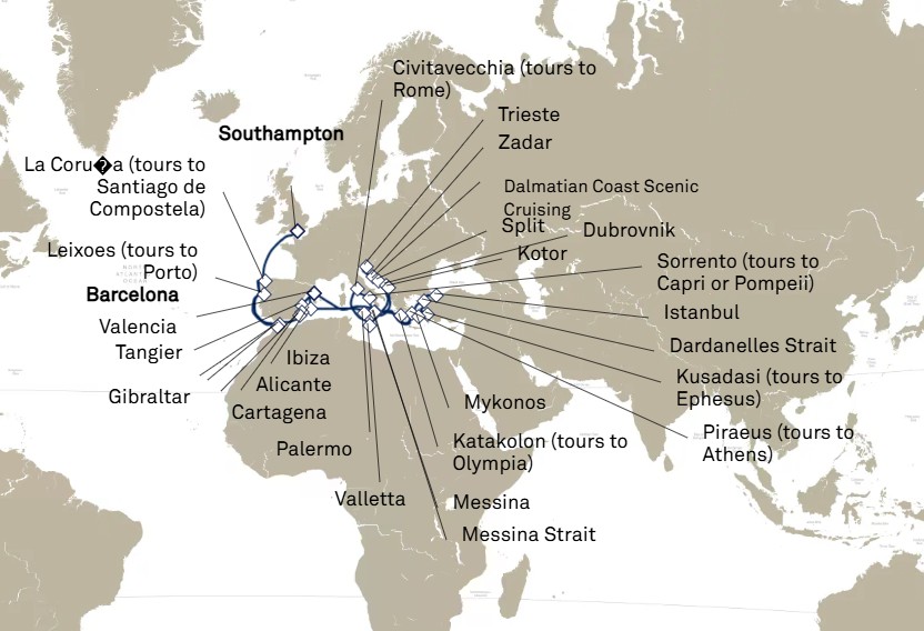- Les excursions facultatives disponibles à Cherbourg (pour les passagers ayant embarqués au Havre le 8 juin) et à Southampton