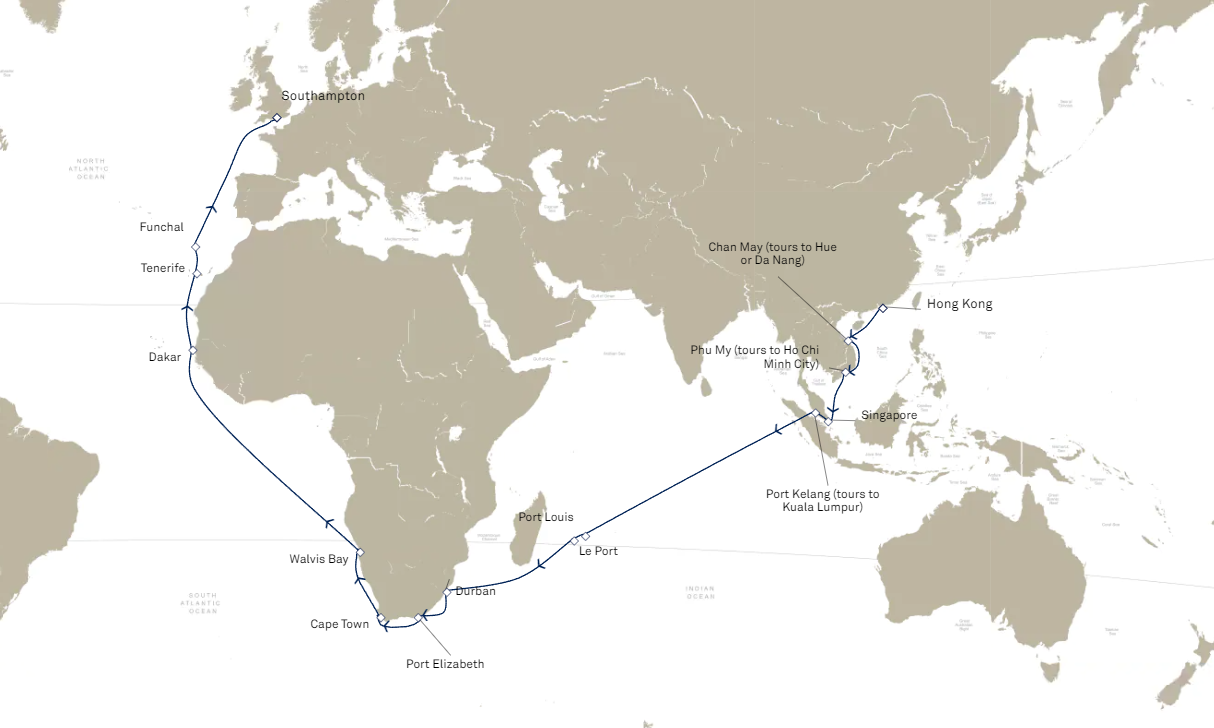 Départ : Hong Kong - Chine / Arrivée : Southampton - Royaume-Uni