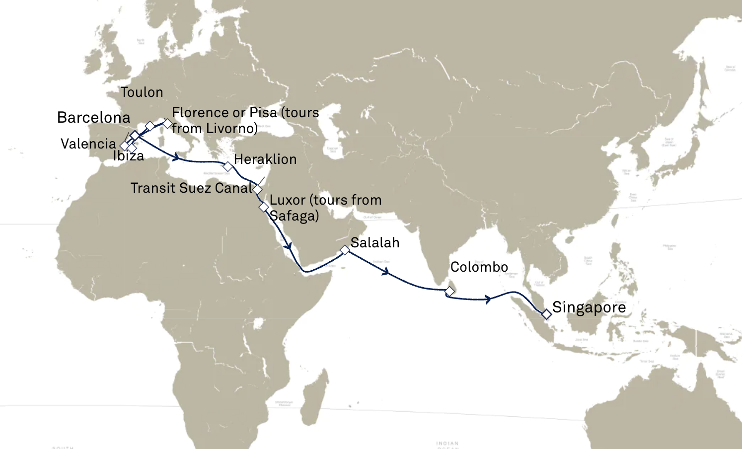Grand Voyage : Méditerranée Occidentale et Singapour, à partir de Barcelone