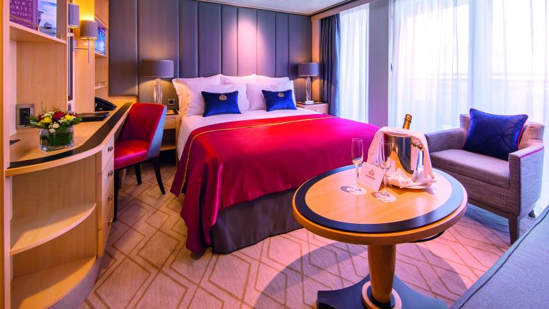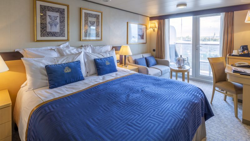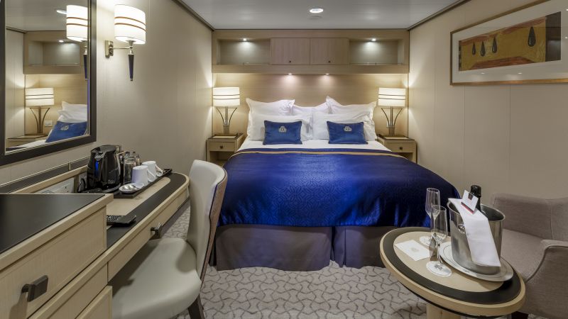 Les cabines extérieures Britannia offrent une vue imprenable sur l’océan, vous permettant de contempler les paysages qui défilent tout au long de votre croisière. D’une superficie de 17 m², elles allient confort et élégance, avec des matériaux de qualité. La décoration raffinée et le confort optimal de la cabine seront des souvenirs inoubliables de vos vacances. Votre cabine dispose d’un lit king-size, d’un coin salon, d’un bureau, ainsi qu’un plateau de courtoisie et d’un service en chambre disponible 24h/24 (sans supplément) pour répondre à tous vos besoins.
