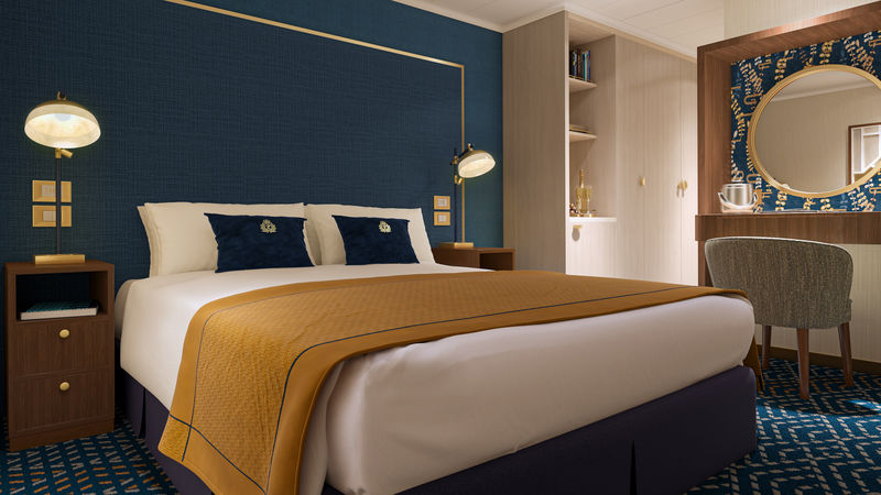 Les cabines extérieures Britannia vous offrent une vue spectaculaire sur l'océan et les paysages changeants qui s’offrent à vous. D’une superficie d’au moins 18 m², elles se distinguent par des couleurs douces et des matériaux nobles, créant une atmosphère élégante et apaisante. Commencez vos journées en admirant la lumière naturelle du matin se diffuser à travers la fenêtre, ou détendez-vous sur votre lit king-size en savourant un délicieux petit-déjeuner, avec l'océan pour toile de fond.