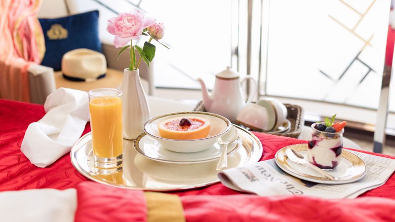 Les passagers en cabine Britannia peuvent également profiter gracieusement d’un petit-déjeuner livré chaque matin jusqu’à 10h00. Pour toute autre commande, des frais s’appliquent, notamment sur certains plats signatures signalés sur le menu.