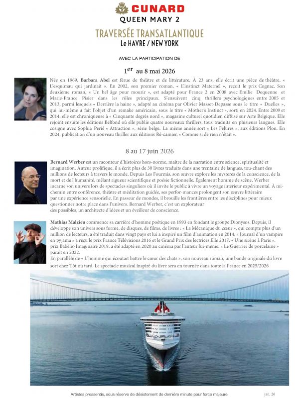 Queen Mary 2 accueille Barbara Abel (1er–8 mai 2026) puis Bernard Werber et Mathias Malzieu (8–17 juin 2026) lors de traversées transatlantiques francophones au départ du Havre où conférences, rencontres intimistes et dédicaces se vivent au fil de l’océan.
